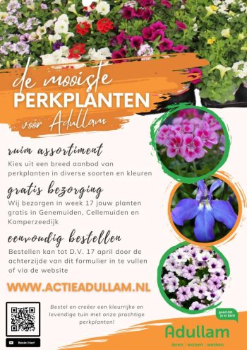 Het voorjaar hangt in de lucht en dat betekent dat het tijd is om de tuin of het balkon weer op te fleuren. Ook dit jaar organiseert het Adullam-comité Genemuiden de bekende perkgoedactie. Of u nu op zoek bent naar planten voor in de volle grond, prachtige hangzakken, gevulde potten of kwaliteits-potgrond: het assortiment is weer zeer ... [...]