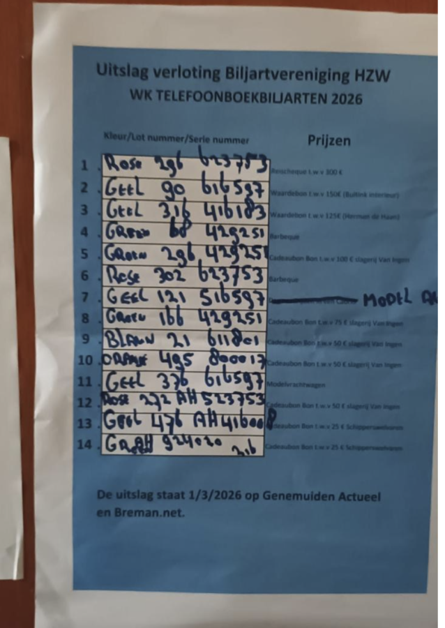 Bijgaand vindt u de uitslag van de grote verloting. Kijkt u a.u.b. uw loten goed na. Naast het lotnummer en de juiste kleur dient ook het serienummer te kloppen. De prijzen zijn op donderdagavond af te halen in “de Rank”.