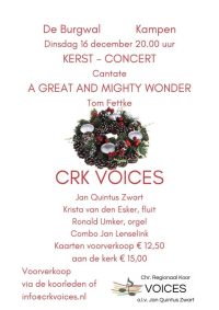 Kampen – CRK Voices geeft op dinsdag 16 december haar jaarlijkse advents-kerst concert in De Burgwal in Kampen. Het concert begint om 20.00. De kerk gaat om 19.15 uur open voor publiek. Het prachtige stuk “A GREAT AND MIGHTY WONDER” van Tom Fettke wordt uitgevoerd. Het Wonder van de geboorte van de Messias wordt uitbundig gevierd in lied, tekst ... [...]