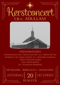 Op D.V. zaterdag 20 december zal er in de Bethelkerk te Genemuiden een kerstconcert worden gehouden. De aanvang van de avond is om 19.30 uur. Meewerkenden van deze avond zijn: - Kinderkoor De Jonge Lofstem o.l.v. Elsemieke Grolleman - Reformatorisch koor Omnia Cum Deo o.l.v. Kampen o.l.v. Klazien de Vos Orgel: Albert Meuleman Piano: Niels ... [...]