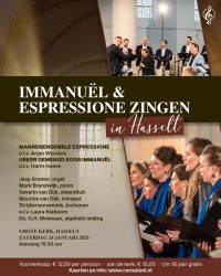 Zaterdag 24 januari verzorgen het Urker Gemengd Koor Immanuël en Mannenensemble Espressione een gezamenlijke kooravond in de Grote Kerk van Hasselt. Tijdens deze avond zullen de koren verschillende bekende en minder bekende stukken laten horen. Daarnaast zijn er diverse momenten van samenzang. De algehele leiding van de avond is in handen van ... [...]