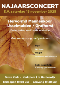 Op DV zaterdag 15 november aanstaande geeft het Hervormd Mannenkoor IJsselmuiden/Grafhorst onder leiding van Freddy Veldkamp een najaarsconcert in de Grote Kerk te Harderwijk. De begeleiders van deze avond zijn Bert Roest op het orgel en Jan Hendrik van Schothorst op de vleugel. De samenzang bestaat uit Psalmen en deze worden niet-ritmisch ... [...]
