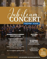 Het Reformatorisch Gemengd Koor Cantilena uit Staphorst houdt op zaterdag 18 april 2026 een jubileumconcert in de Grote Kerk te Hasselt. Aanleiding is het twintigjarig bestaan van het koor, dat in maart 2006 werd opgericht. Cantilena bestaat uit circa 100 leden en staat onder leiding van Harm Hoeve. Voor het concert werkt het koor samen met ... [...]