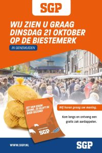 De SGP Zwartewaterland is aanwezig op de Biestemerk. Je vindt onze marktkraam aan de Kruisstraat, ter hoogte van de Kruidvat. Kom langs, praat mee en ontmoet de SGP Zwartewaterland. Deel je mening - wij luisteren graag! En om het nog leuker te maken: Deel uw mening en ontvang een gratis zak aardappelen van eigen bodem! ... [...]