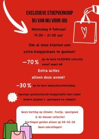 Vanaf 19.00 uur staat de deur open, en mag iedereen genieten van deze exclusieve stoepverkoop. Omdat we vaak de vaste klanten op de zaterdag stoepverkoop niet zien, hebben wij een extra stoepverkoop bedacht! Vanaf 19.00 uur hebben we 70% korting op de wintercollectie vanaf maat 68. Omdat de winter nog wel even duurt, een mooie kans om met ... [...]