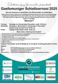 Bedrijven, vrienden en familiegroepen kunnen zich weer opgeven voor het Gaellemuniger schiettoernooi. In Week 45 kunnen mensen komen trainen en week 46 zijn de wedstrijddagen en finale avond. Vanaf heden kunnen jullie je weer opgeven zoals jullie gewend waren. Heren, dames of een gemengd team. Opgave kan via de website voorkeur ... [...]
