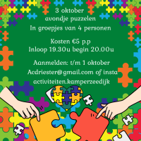 Op vrijdag 3 oktober gaan we de strijd weer aan, wie legt het snelst een puzzel van 1000 stukjes in elkaar! Nu is deze activiteit altijd snel vol en er kunnen echt maar 25 groepen van 4 personen meedoen. Ook mag de jeugd van 10 tot 14 jaar mee puzzelen, daar hebben we puzzels van 500 stukjes voor. Dus wacht niet met opgeven want vol is ... [...]