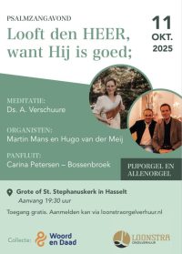 Zaterdag 11 oktober bent u van harte welkom op de psalmzangavond in de Grote of Stephanuskerk in Hasselt. De te zingen psalmen passen bij het thema van deze avond: Looft den HEER, want Hij is goed. Ds. Verschuure uit Genemuiden zal een inleiding verzorgen rondom dit thema. Naast het kerkorgel zal ook het Allen-concertorgel bespeeld worden. ... [...]