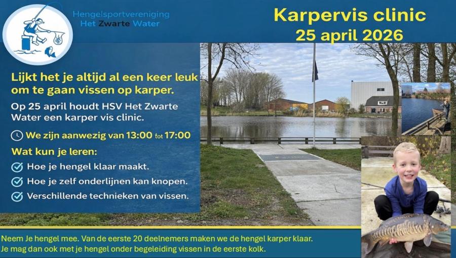 25 april is er een clinic over kapervissen voor jong en oud in en om het clubhuis van HSV het zwartewater Hasselterdijk 13a Genemuiden. Iedereen die meer wil weten over karpervissen of zelf wil leren een onderlijn knopen is van harte uitgenodigd.