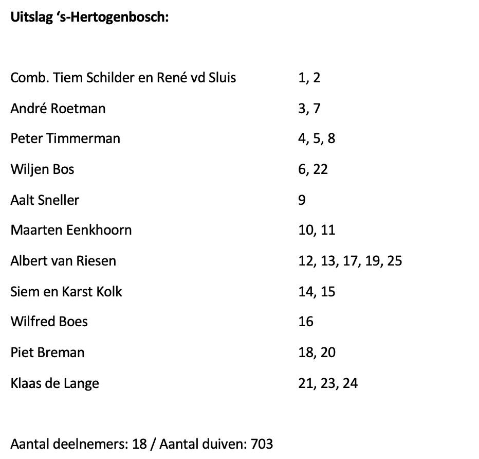 De combinatie Tiem Schilder en René van der Sluis hadden hun duivinnen al scherp staan en gingen er vandoor met de plaatsen 1 en 2, gevolgd door een duivin van André Roetman.