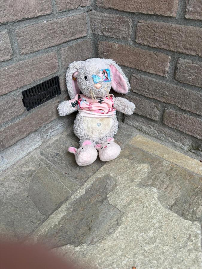 Op de Greente 167 heeft iemand deze knuffel verloren. Iemand heeft deze bij ons op de heg gezet.