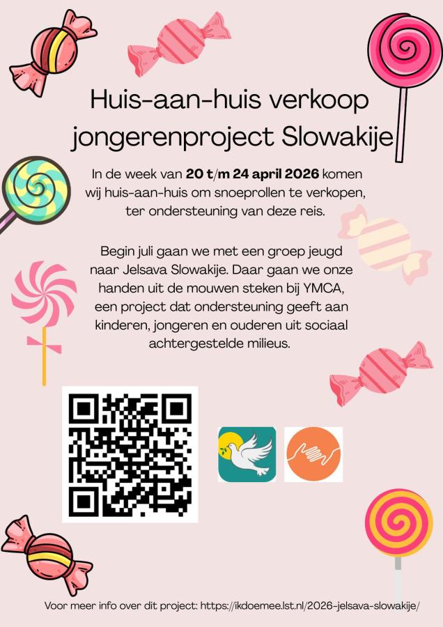 Voor het jongerenproject Slowakije houden we een huis-aan-huis verkoop. Er worden zakjes met snoeprollen verkocht.