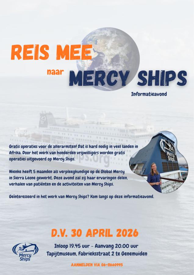 De afgelopen vijf maanden is Nienke Slingerland werkzaam geweest als verpleegkundige op de Global Mercy in Sierra Leone. Tijdens deze informatieavond zal zij het werk van Mercy Ships nader toelichten d.m.v. ervaringen, verhalen van patiënten en de activiteiten waar Mercy Ships zich voor inzet.