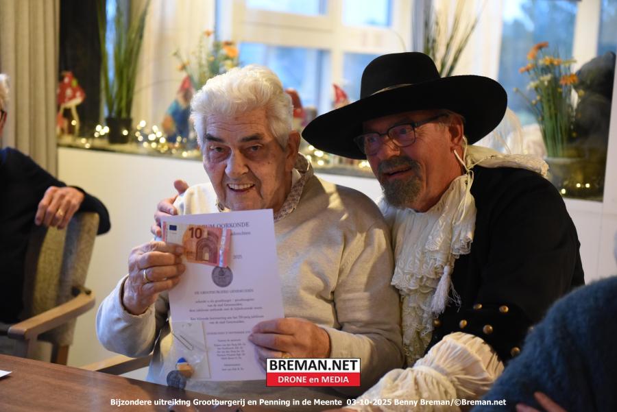 Doel van het bezoek was het uitreiken van de ‘de Weide’ de 10 euro en de speciaal gemaakte oorkonde en penning aan de grootburgers in de Meente.