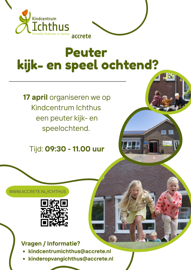 Op vrijdag 17 april aanstaande opent Kindcentrum Ichthus haar deuren voor (toekomstige) peuters en hun ouders. Van 09.30 – 11.00 uur is er gelegenheid om een kijkje te nemen en mee te spelen in één van de kleutergroepen.