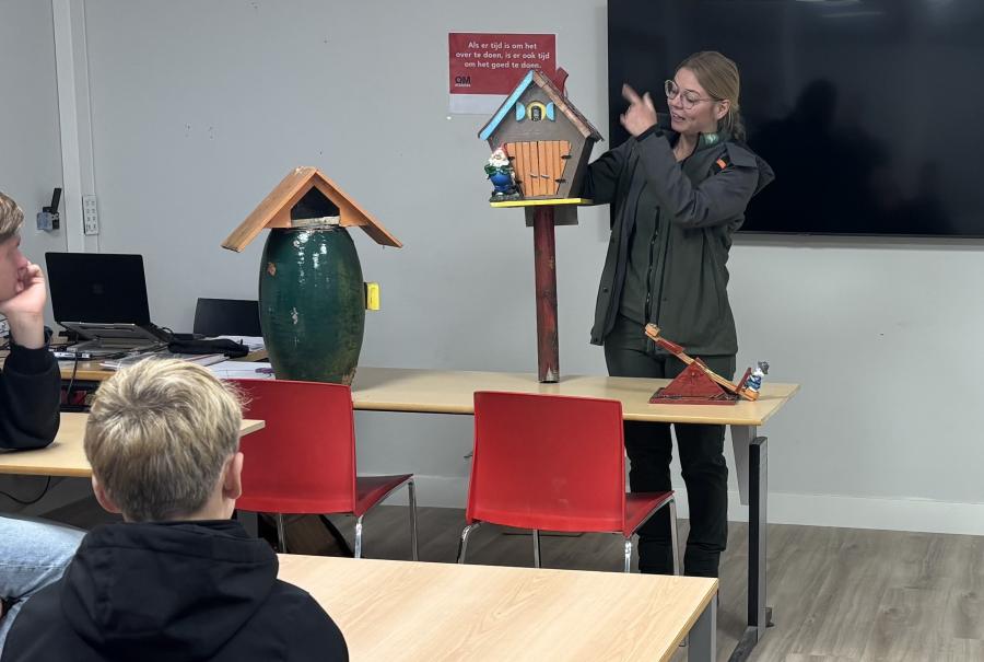 “Huisjes zijn vernield en kabouters zijn vertrapt of meegenomen,” stond in het nieuwsbericht dat de leerlingen onder ogen kregen. Dat raakte hen zichtbaar. “Wat kunnen we doen om te helpen?” vroeg Klooster aan zijn klas. Al snel werd contact gelegd met Staatsbosbeheer, en binnen een week stond boswachter Marline Wennink voor de klas om uitleg te geven over de schade en de plannen voor herstel.