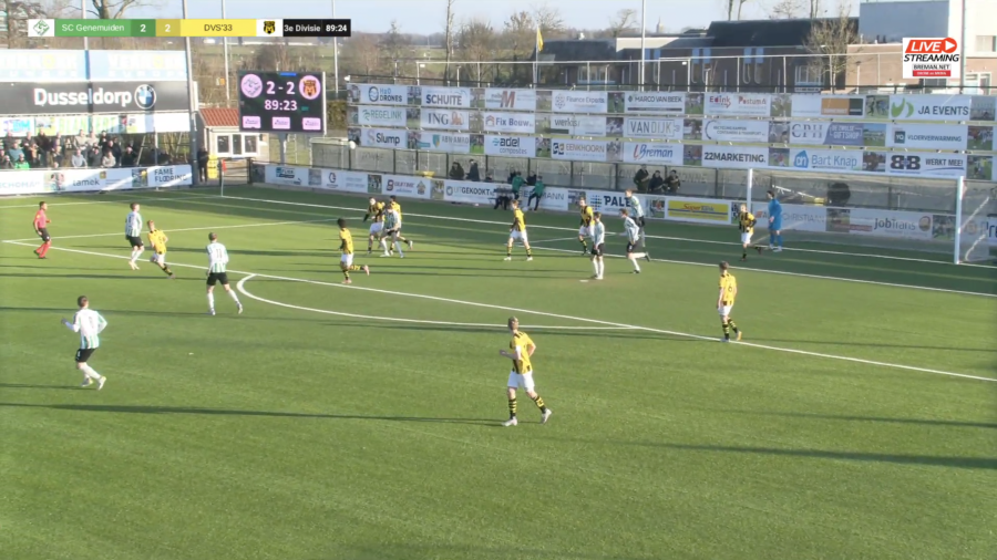 Ook in de 81e minuut kreeg Genemuiden een grote kans. Arend van de Wetering legde de bal panklaar voor Grevink, maar diens inzet scheerde over de lat. In de slotfase liepen de emoties op en moest scheidsrechter Henon enkele kaarten trekken, ook richting de bank van DVS ’33. In de allerlaatste minuten leek Genemuiden alsnog met de winst aan de haal te gaan, maar een kopbal van Gerben Kolk belandde op de lat, waardoor het bij 2-2 bleef. Het was typerend voor een middag waarop beide ploegen kansen genoeg kregen, maar geen van beiden het beslissende zetje wist te geven.