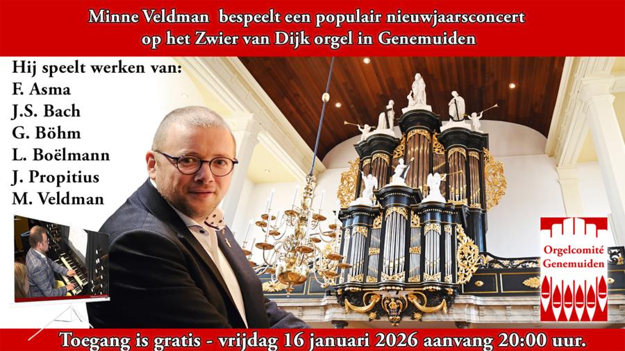 Kom genieten van een inspirerende muzikale avond in de sfeervolle ambiance van Genemuiden. Iedereen is van harte welkom – neem gerust familie, vrienden en buren mee. Laat u verrassen door de veelzijdigheid van het Zwier van Dijk-orgel en de virtuositeit van Minne Veldman. Tot ziens op 16 januari! Op een scherm kan worden meegekeken naar de verrichtingen van de organist. Meer informatie is te vinden op de website van www.orgelcomitegenemuiden.nl en info@minneveldman.nl