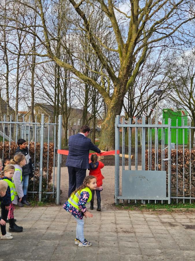 Vanmiddag is officieel het Sport en Spel bos tussen de Vogelaar en de Morgenster geopend. 4 jaar geleden waren er de eerste voorzichtige gesprekken om te kijken of de beide scholen meer de samenwerking op konden gaan zoeken. Het pleintje tussen de scholen was meer een uitlaatgebied voor honden, dan een fijne speelplek. Daar moest verandering in komen. Hoe mooi zou het zijn dat de pleinen van beide scholen uit eindelijk in elkaar over zouden lopen.