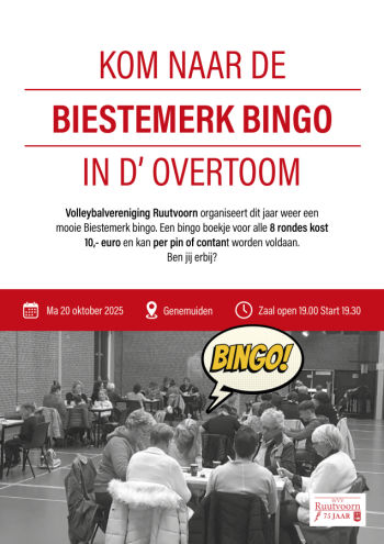 Tijdens Biestemerk Eumpien op 20 oktober 2025 organiseert volleybalvereniging Ruutvoorn dit jaar de Biestemerk bingo. Het belooft een gezellige avond te worden waarbij deelnemers acht rondes lang kans maken op uiteenlopende prijzen. De bingo vindt plaats in de grote sportzaal van d'Overtoom in Genemuiden. De zaal gaat om 19.00 uur open en om 19.30 ... [...]