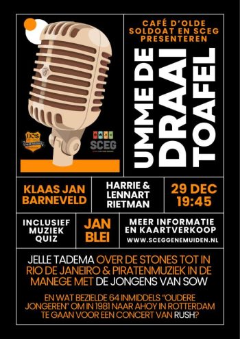 Het is inmiddels al een traditie. In een Top 2000 café setting organiseert de SCEG in samenwerking met d’Olde Soldoat weer “Umme de draai toafel”. Dit jaar is het niet anders. Muziek is als vanouds het centrale thema. Rolling Stones liefhebber Jelle Tadema, sinds een jaar inwoner van Genemuiden, vertelt over zijn passie voor deze band. Zag ze ... [...]