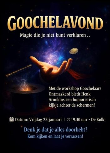 Op vrijdag 23 januari 2026 staat jeugdvereniging De Kolk in het teken van verbazen! Vanaf 19.00 uur is iedereen vanaf 12 jaar welkom voor een bijzondere goochelavond, waarin plezier en geheimen centraal staan. Het hoogtepunt van de avond is de interactieve workshop : Goochelaar ontmaskert”. Tijdens deze workshop krijgt de jeugd een uniek ... [...]