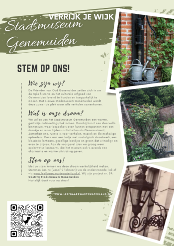 Stichting Vrienden van Oud Genemuiden heeft een prachtige droom: het Oude Raadhuis aan de Langestraat nieuw leven inblazen en omvormen tot een gastvrij Stadsmuseum waar iedereen zich welkom voelt. Een plek om binnen te lopen, te ontdekken en te genieten. De historische gevel krijgt haar oude grandeur terug, compleet met twee authentieke ... [...]