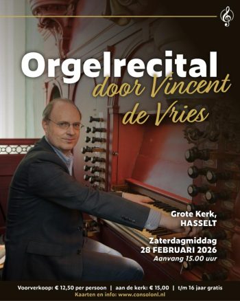 Op zaterdag 28 februari zal Vincent de Vries een middagconcert verzorgen op het Rudolph Knolorgel van de Grote Kerk te Hasselt. Vincent begint zijn concert met toccata Psalm 118 van Jan Zwart. Daarna zal hij o.a. werken van Corelli, Bach, De Lange sr. en Boëllmann spelen. Het orgelconcert sluit hij af met variaties over het lied ‘Jezus neemt de ... [...]