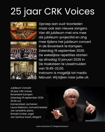 Het komende jaar hoopt CRK Voices o.l.v. Jan Quintus Zwart het 25 jarig bestaan te mogen gaan vieren en dat willen we gaan doen met een feestelijk jubileum concert. In de Bovenkerk van Kampen met medewerking van onder meer een orkest in symfonische bezetting en natuurlijk de vaste en bekende gezichten. Pianist Jan Lenselink en organist Ronald ... [...]