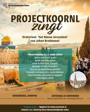 Op zaterdag 22 november zal het ProjectkoorNL o.l.v. Harm Hoeve een concert verzorgen in de Bovenkerk van Kampen. ProjectkoorNL bestaat uit 200 leden! Er wordt deze avond een collecte gehouden voor het werk van Stichting Steun Messiasbelijdende Joden. Deze stichting viert dit jaar haar 25 jaar bestaan. Dit jubileum wordt dit jaar gevierd met ... [...]
