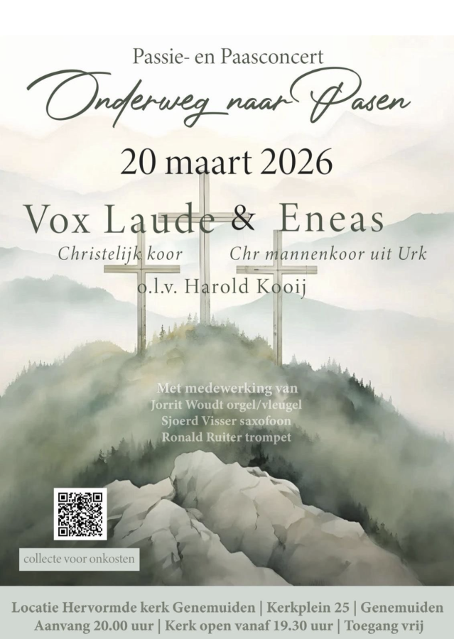20 maart a.s. hopen christelijk koor Vox Laude uit Genemuiden en christelijk mannenkoor Eneas uit Urk beide o.l.v. Harold Kooij een passie-en paasconcert te geven.