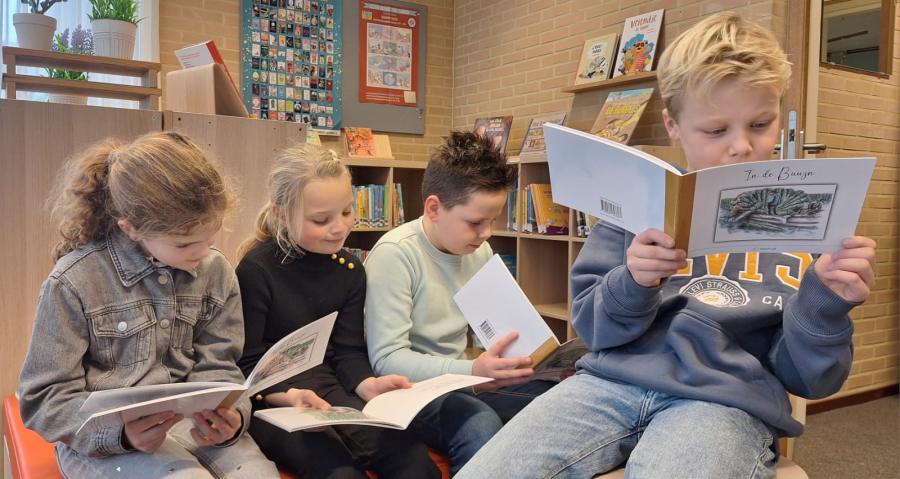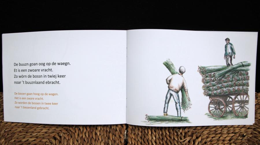 ‘Genemuiden lag letterlijk bedolven onder de biezen, vers gesneden, of reeds half gedroogd, biezen langs de kaden, op de stoepen; straten vol met biezen. De huizen zijn er mee volgepropt, uit de zolderramen puilen biezen naar buiten’, zo zag de bekende schrijver, onderwijzer en natuurbeschermer Jac.P. Thijsse in 1914 Genemuiden. En dat is de leefwereld van Siem, Greet en Trui in het Genemuider prentenboek ‘In de buuzn’. Het boek neemt de lezers door de ogen van kinderen in het Genemuider dialect en in het Nederlands mee in de leefwereld van huisnijverheid aan het begin van de 20e eeuw. Het is de bieswereld van snijden, drogen, vlechten, mattenramen en het naaien van een blokmat op de grond. En via de qr-code voorin hoor je het boek voorlezen in het Gaellemunigers door Einbert van Rees. Andere delen van de serie zijn: ‘De melkrieder’ en ‘De dörsmesiene’.