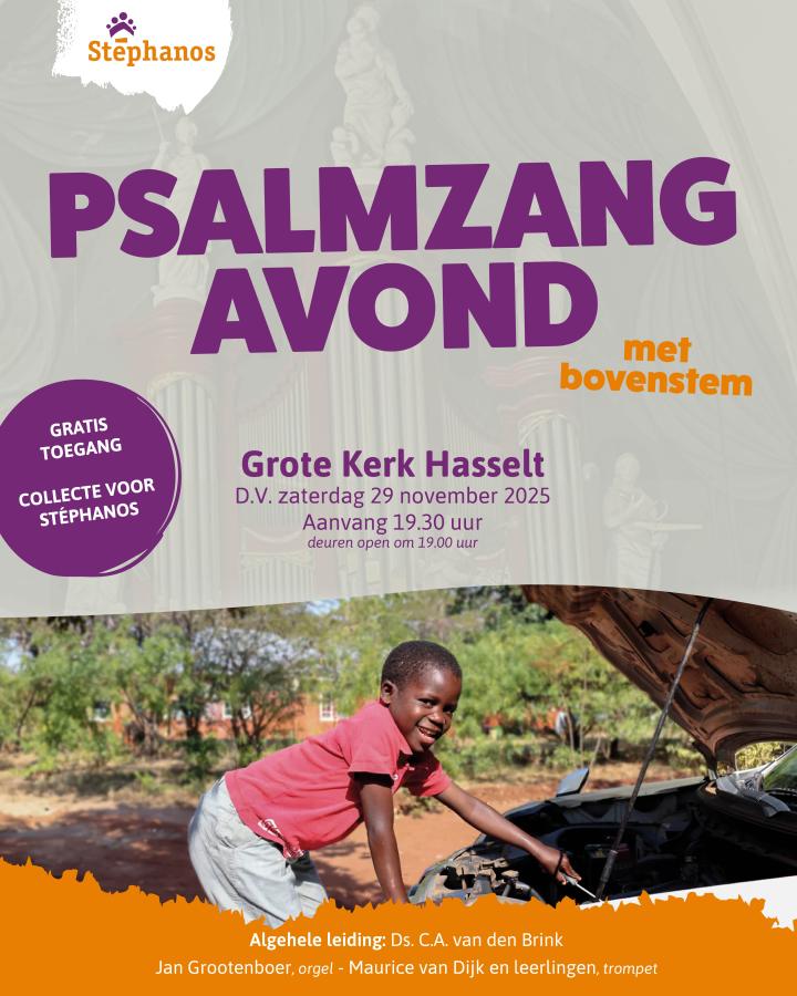 Op D.V. zaterdag 29 november zal de jaarlijkse Psalmzangavond voor stichting Stéphanos weer gehouden worden in de Stephanuskerk in Hasselt. Deze avond begin om 19:30 uur, de deuren zijn geopend vanaf 19:00 uur. Algehele leiding is in handen van ds. C.A. van den Brink. Jan Grootenboer bespeelt het orgel en Maurice van Dijk levert met een groot aantal van zijn leerlingen muzikale omlijsting op de trompet. Een aantal psalmen wordt met bovenstem gezongen. De toegang is gratis. Er zal een collecte gehouden worden t.b.v. stichting Stéphanos voor haar werkzaamheden in Malawi en Zambia. Ook dit jaar is iedereen weer van harte welkom. I.v.m. meerdere wegafsluitingen wordt parkeren bij het Gemeentehuis of op de Grintwal aangeraden.