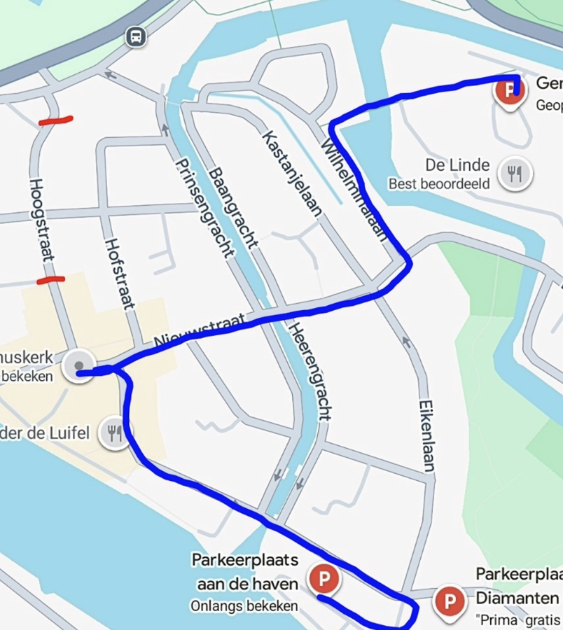 Hieronder geven de blauwe lijnen de wandelroute vanaf de parkeerplaatsen naar de kerk aan.