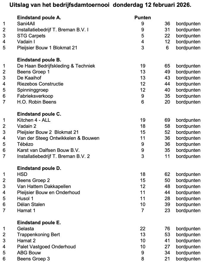 • Uitslagen damclub O&O d.d. 09-02-2026