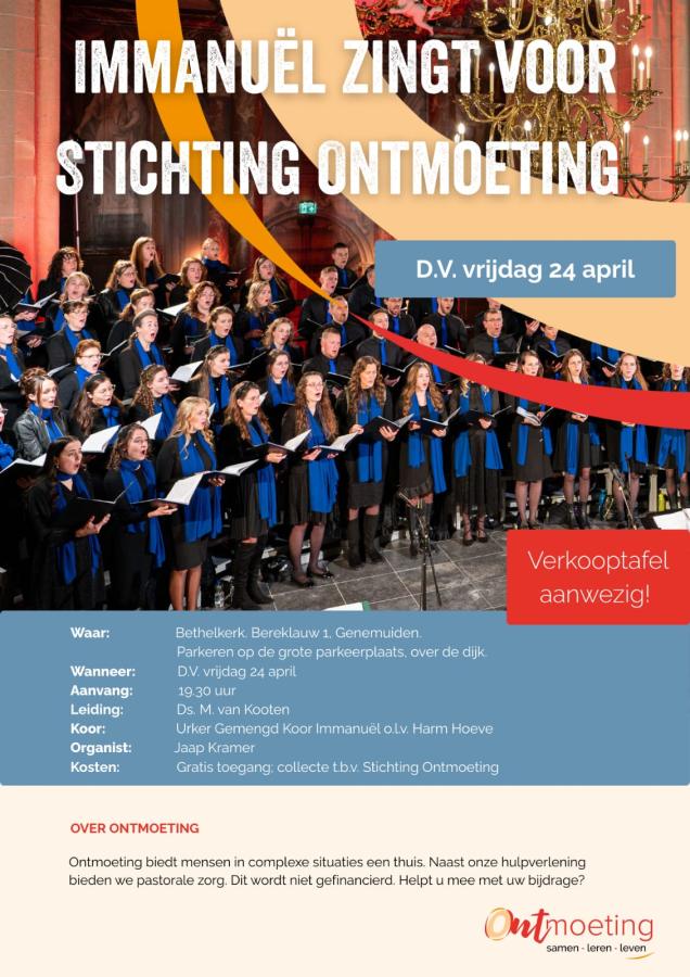Urker Gemengd Koor Immanuël zingt D.v. vrijdagavond 24 april voor Stichting Ontmoeting in de Bethelkerk in Genemuiden. Iedereen van harte welkom. Zet u/je de datum alvast in de agenda? We ontmoeten jullie graag!