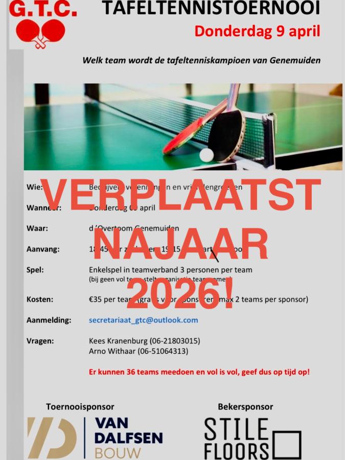 Helaas kan ons toernooi niet doorgaan 9 april.