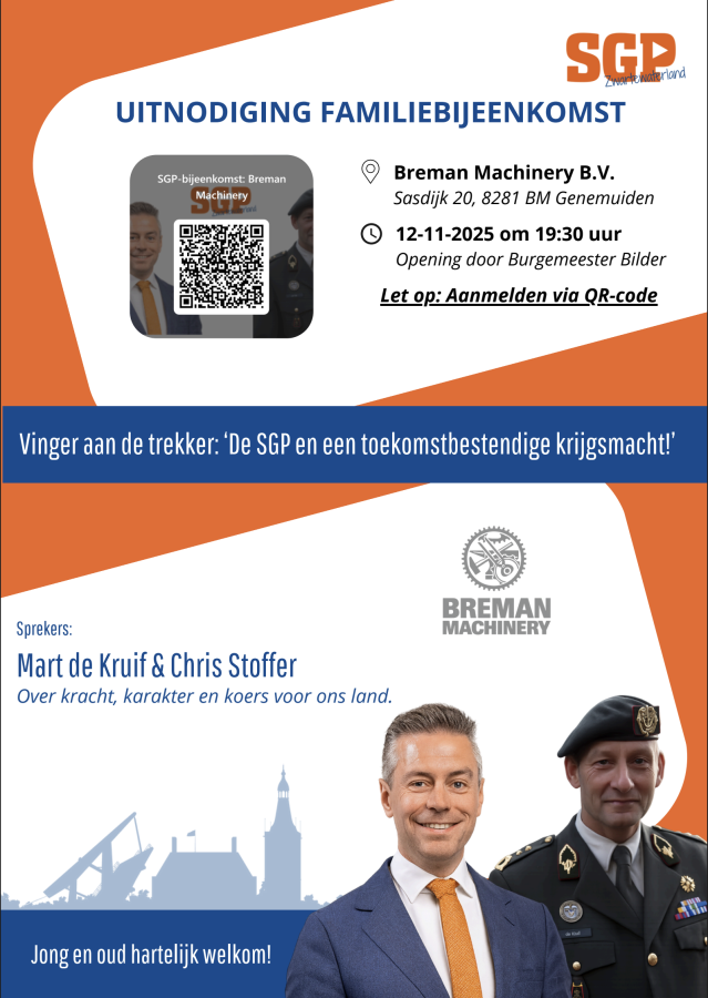 Voormalig commandant der strijdkrachten Mart de Kruif geeft die avond een militaire briefing over de brandhaarden in de wereld. Hij zal ook zijn licht laten schijnen over de veiligheidsuitdagingen die Nederland en de wereld hebben. Het zijn immers spannende tijden? SGP-fractievoorzitter Stoffer, woordvoerder van de meest realistische defensiepartij uit de Nederlandse parlementaire geschiedenis, voert eveneens het woord. Wat vraagt het huidige dreigingsniveau van de politiek na al die jaren bezuinigen waartegen de SGP geprotesteerd heeft als een roepende in de woestijn? Tijdens deze avond zal Breman Machinery ook van zich laten horen, want dit Geallemuniger bedrijf heeft wat met defensie! Ooit geweten dat op ons industrieterrein bijgedragen wordt aan het veilig houden van Nederland? Na de pauze is er een interactief moment waarbij vragen uit de zaal via een forum bij de sprekers komen. Kortom, het belooft een inspirerende avond te worden. Voor een goede catering wordt gezorgd. Zorg jij dan, dat je je op tijd aanmeldt, want vol = vol.