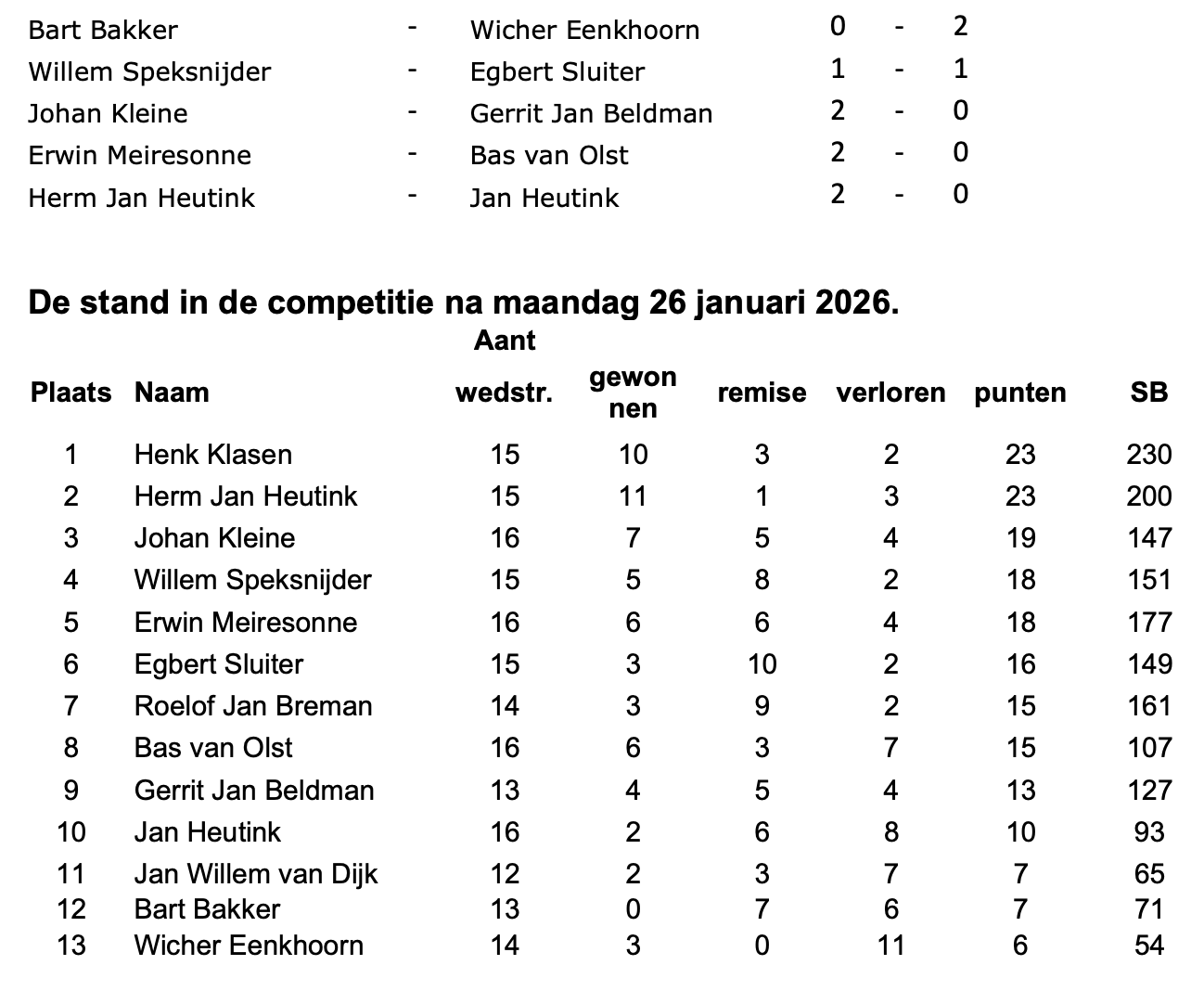 • Uitslagen damclub O&O d.d. 26-01-2026