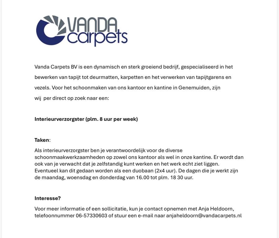 Vacature : Interieurverzorgster (plm. 8 uur per week)