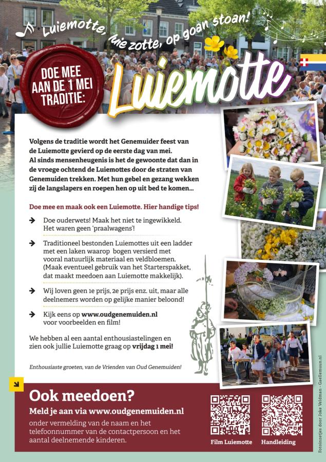 In een starterspakket zitten de meeste materialen die nodig zijn voor de bouw van een Luiemotte. Deelnemers moeten dan alleen zelf nog de veldbloemen verzamelen en de Luiemotte versieren in de laatste dagen voor 1 mei. Hoe het allemaal precies werkt, is ook te vinden op de website www.oudgenemuiden.nl. Een pakket aanvragen kan via info@oudgenemuiden.nl.