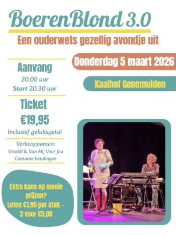 Donderdag 5 maart gaan we weer ouderwets gezellig genieten van Boerenblond. Het nieuwe jaar gelijk maar eens goed starten met een schaterlach! Vanaf 20.00 uur staan de deuren van de Kaaihof open, en kunt u zelf een mooie plek uitzoeken. Klokslag 20.30 uur zal Boerenblond het podium betreden, en kunnen de buikspieren aangespannen ... [...]